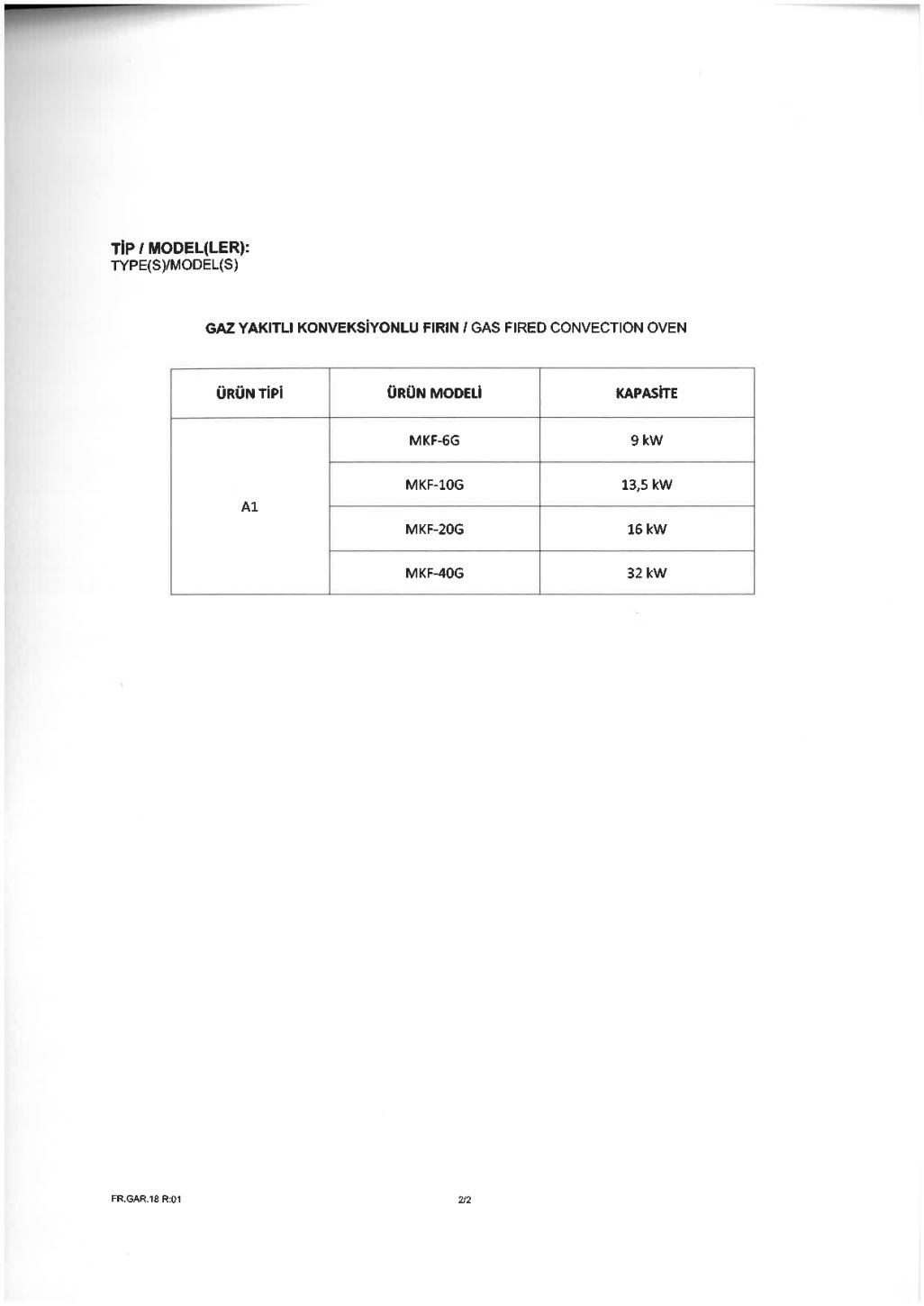 CE Uygunluk Sertifikası (Modül C2) "Gaz Isıtmalı Konveksiyonlu Fırınlar" Model Tablosu