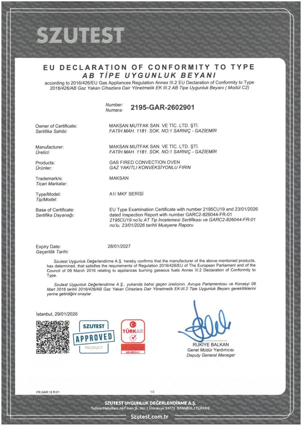 CE Uygunluk Sertifikası (Modül C2) "Gaz Isıtmalı Konveksiyonlu Fırınlar"